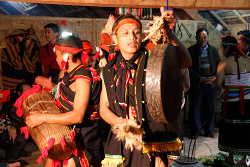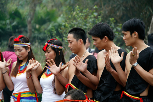 Trong khi chủ lễ đang khấn thần linh, các thanh niên trong làng đứng giơ hai tay lên trời, bày tỏ lòng thành kính với thần linh, cũng như mong cầu mưa xuống.